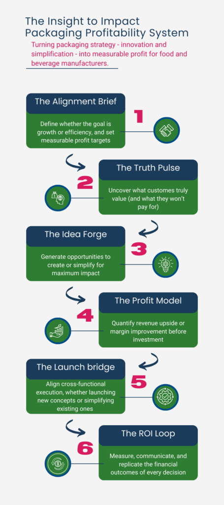 The Insight-to-Impact Packaging Profitability System helps food and beverage companies unlock profit from their packaging portfolios—whether by launching new, high-ROI innovations or optimizing existing SKUs for efficiency and focus.